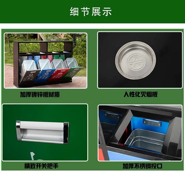 Sản phẩm nổi bật với các đặc điểm: Thép không gỉ ngoài trời ba hoặc bốn phân loại nắp lắc lớn thùng rác vệ sinh môi trường cộng đồng ngoài trời tái chế hộp vỏ tùy chỉnh