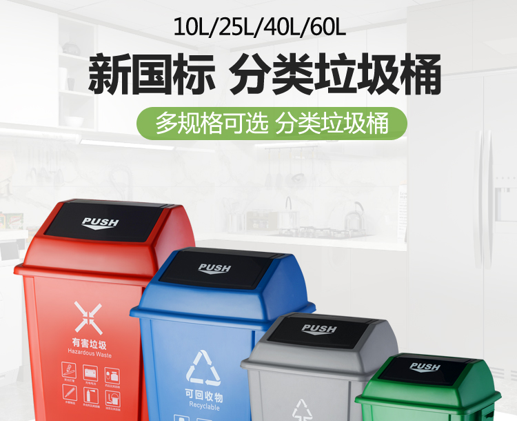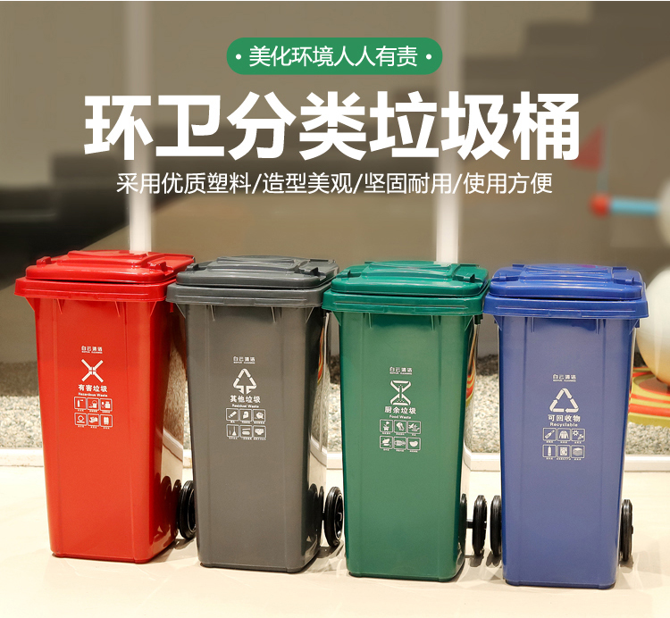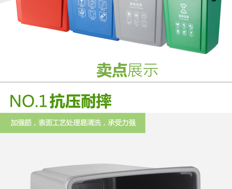 Sản phẩm nổi bật với các đặc điểm: Tiêu chuẩn quốc gia mới thùng rác phân loại bốn màu thùng rác nhựa có nắp đậy nhà trẻ vệ sinh ngoài trời thương mại cộng đồng tài sản cực lớn