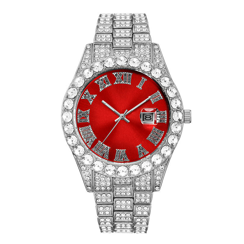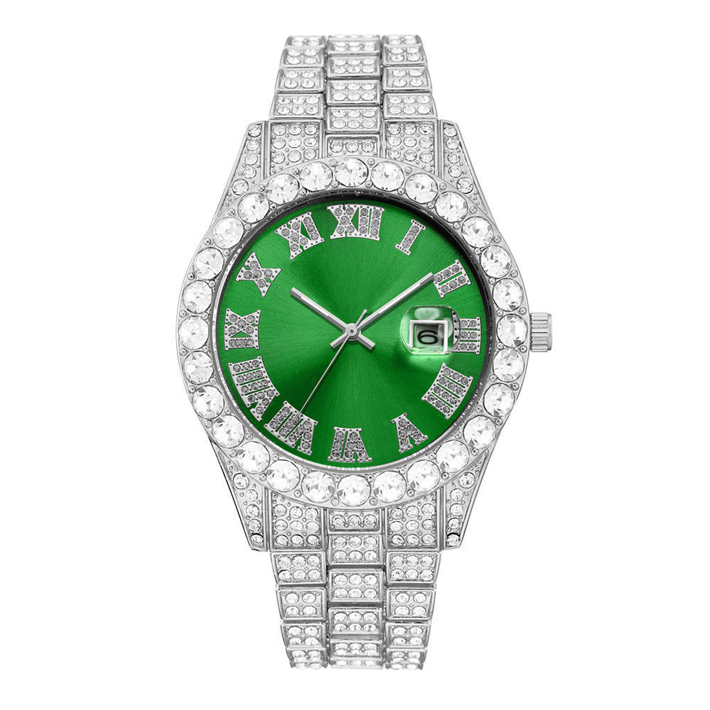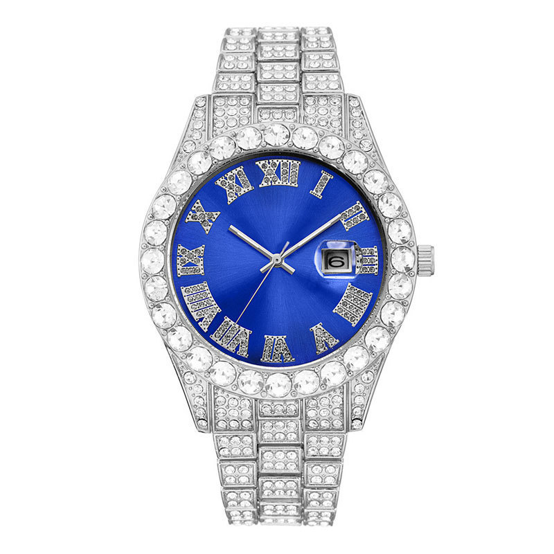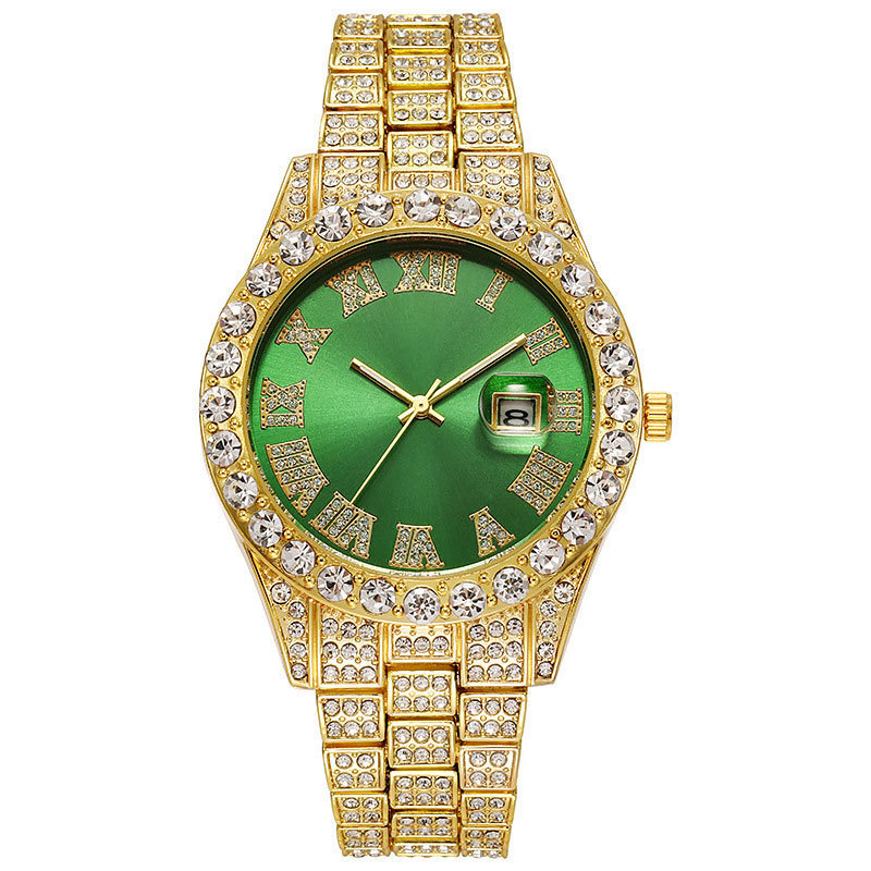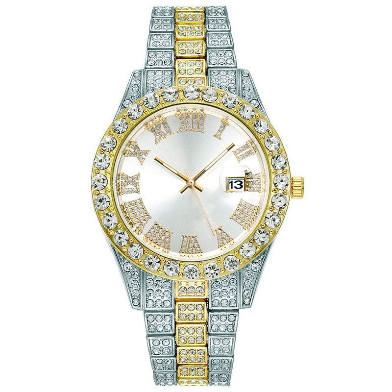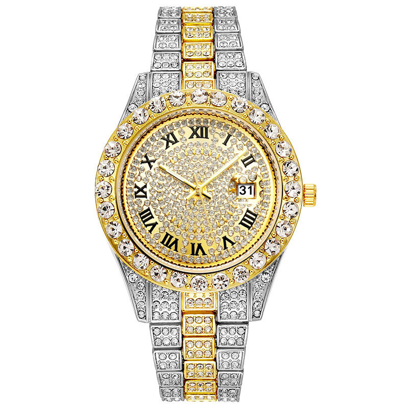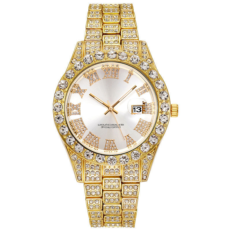 Thương mại nước ngoài thời trang mới kim cương đầy đủ đồng hồ nam nước ma đầy sao lịch đồng hồ thạch anh dây thép nam màu vàng hàng hiệu suất