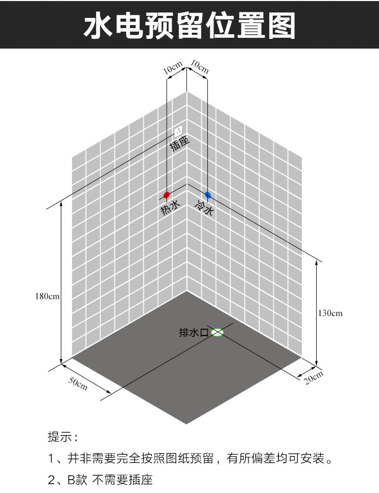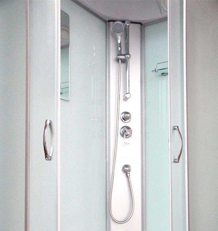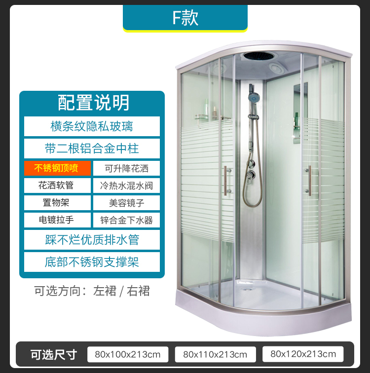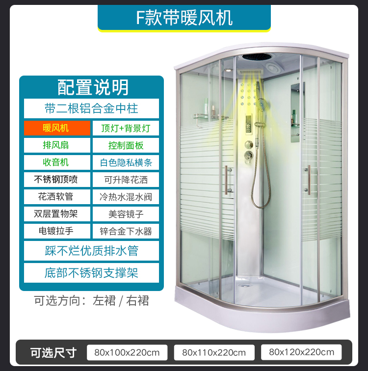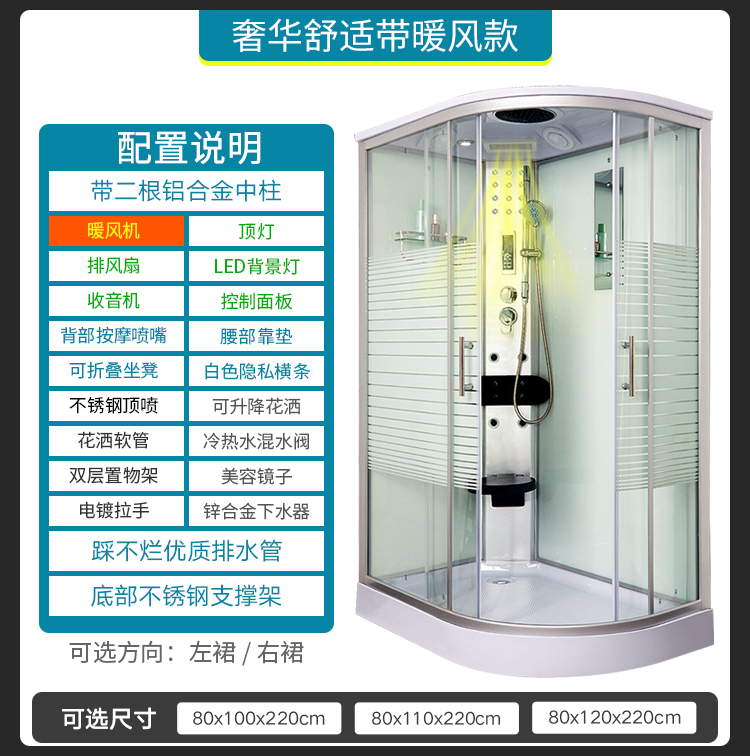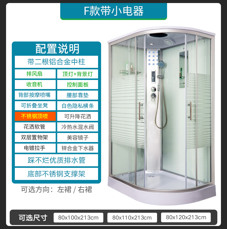 带二根铝合金中柱、大顶喷、可升降花洒、花洒软管、冷热水混水阀、置物架、美容镜子、电镀拉手、锌合金下水器、排水软管
