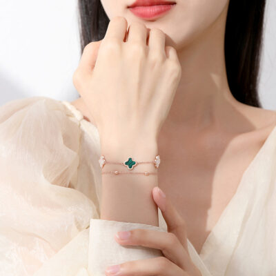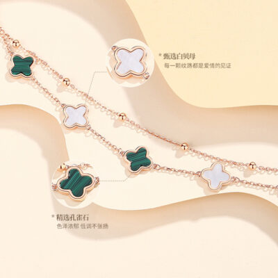 Tikia Thật Bắn Ánh Sáng Thời Trang Cao Cấp Bạc 925 Đá Malachite Cỏ Bốn Lá Vòng Tay Nữ Đôi Hoa Hồng Vàng Tay Trang Sức