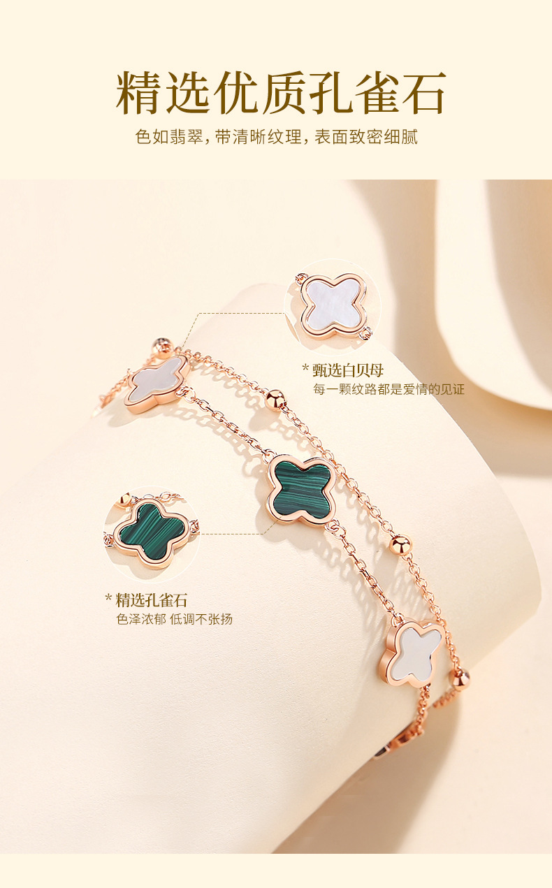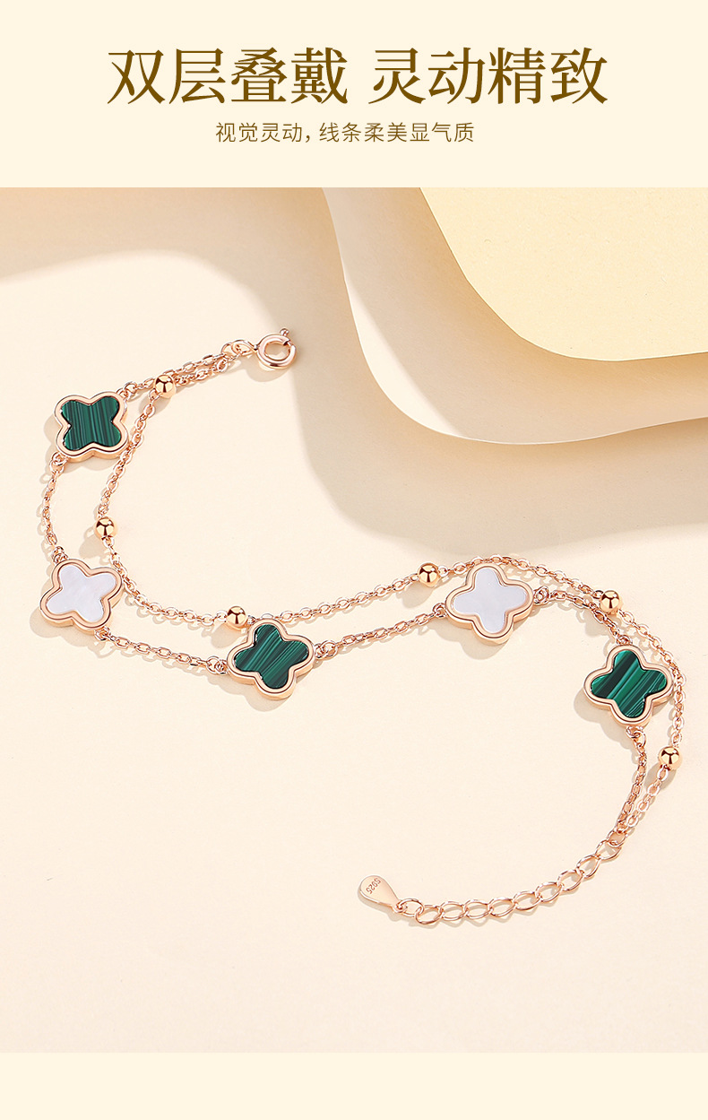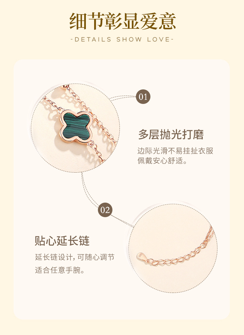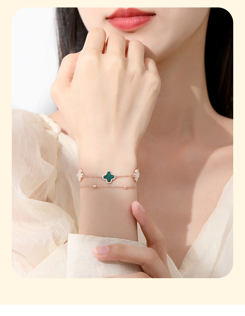 Tikia Thật Bắn Ánh Sáng Thời Trang Cao Cấp Bạc 925 Đá Malachite Cỏ Bốn Lá Vòng Tay Nữ Đôi Hoa Hồng Vàng Tay Trang Sức