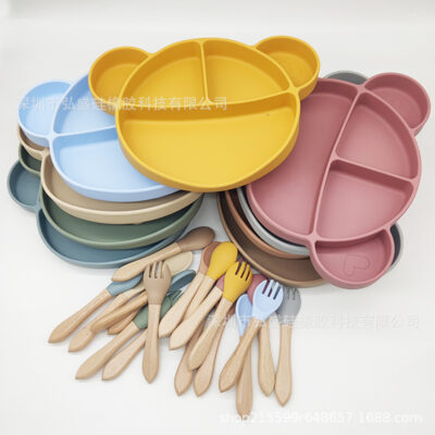 Trẻ Em Bộ Đồ Ăn Bằng Silicon Yếm Silicone Sản Phẩm Cho Bé Tất Cả Trong Một Thực Phẩm Bổ Sung Đĩa Muỗng Nĩa Gỗ Chống Rơi bộ