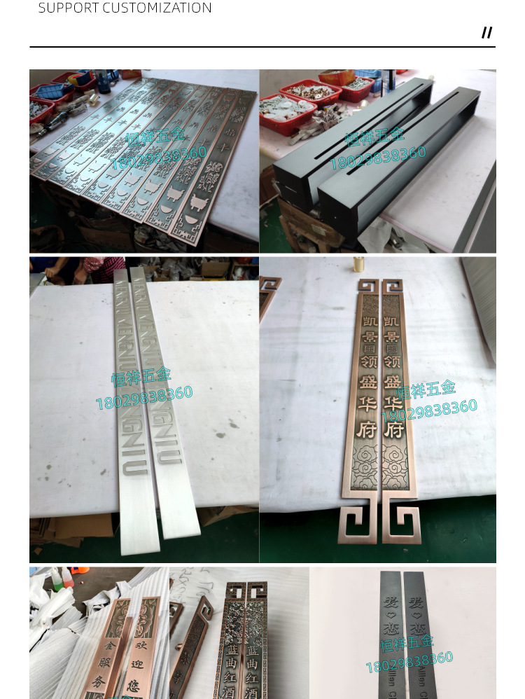 本工厂支持定制各种款式门拉手,不锈钢拉手,铝板雕刻拉手,实木拉手,仿玉石拉手,镶嵌拉手,折板拉手,异形拉手等,欢迎来图咨询定制。