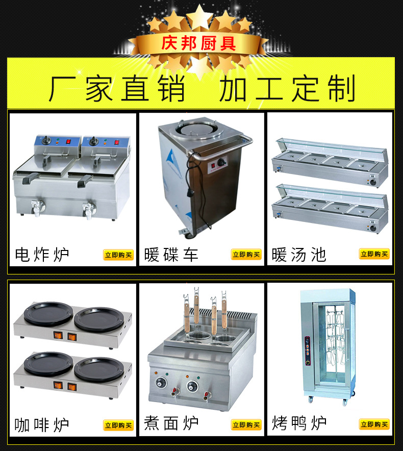 广州庆邦厨具有限公司,其前身是广州金科公司,是一家专业西厨小吃设备的工厂,我们的主营产品有:奶昔机,暖汤池,爆米花机,煮面炉,带阀炸炉,扒炉,烤鸭炉,热狗机,华夫炉,雪糕皮机,沙冰机,开水桶,餐车,保温桶,工作台,洗碗机花洒龙头,星盘龙头,网式层架等等。