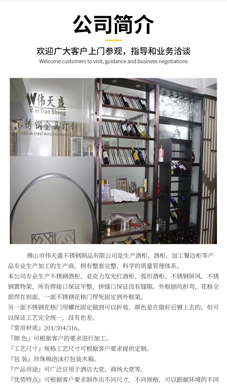 Số sản phẩm: Tủ rượu nhiệt độ không đổi bằng thép không gỉ 4 Thương hiệu: Wetiansheng Màu sắc: Màu sắc như hình Model: Tủ rượu nhiệt độ không đổi bằng thép không gỉ 4 Phương pháp xử lý: Tùy chỉnh theo bản vẽ Có bằng sáng chế hay không: Không Thông số kỹ thuật: Tùy chỉnh Có mô hình 3D hay không: Không Liệu nó có được giao đến tận nhà của bạn hay không: Giao hàng đến Điểm nhận hàng có cung cấp dịch vụ lắp đặt không: Không Số bằng sáng chế: Không Đây có phải là người nộp thuế chung không: Không Chức năng: 18969844106 Chất liệu: Thép không gỉ Không gian: Phòng khách Đối tượng áp dụng: Người lớn Là nó xuất khẩu xuyên biên giới Nguồn cung cấp: Không Kiểu dáng: Hiện đại, đơn giản