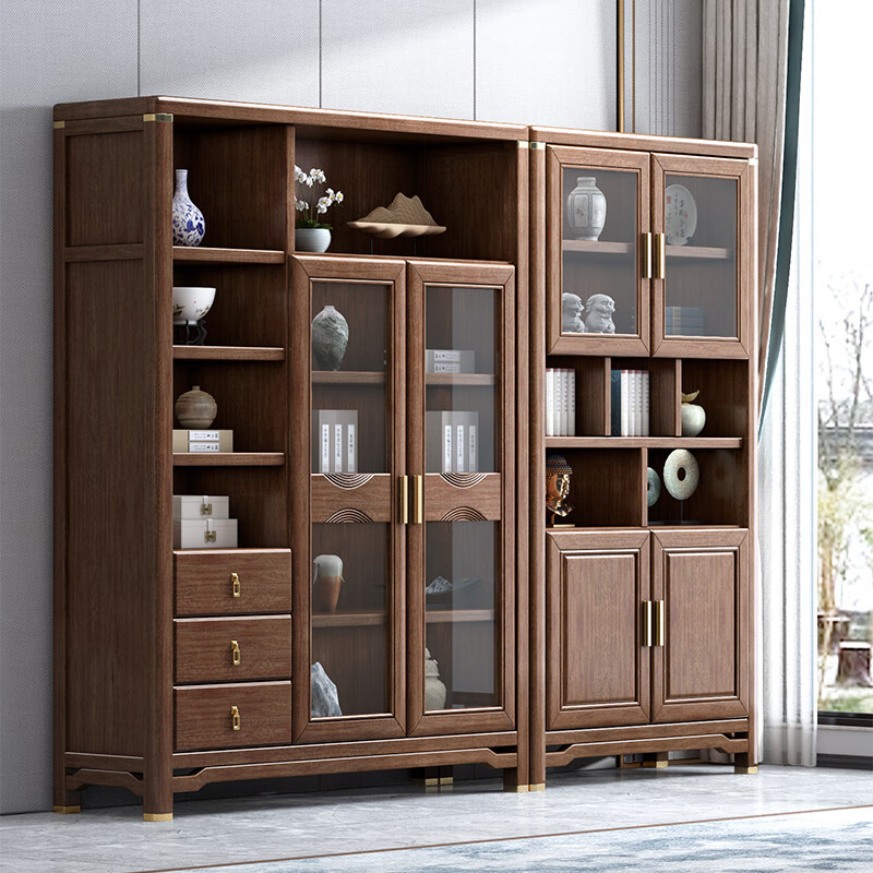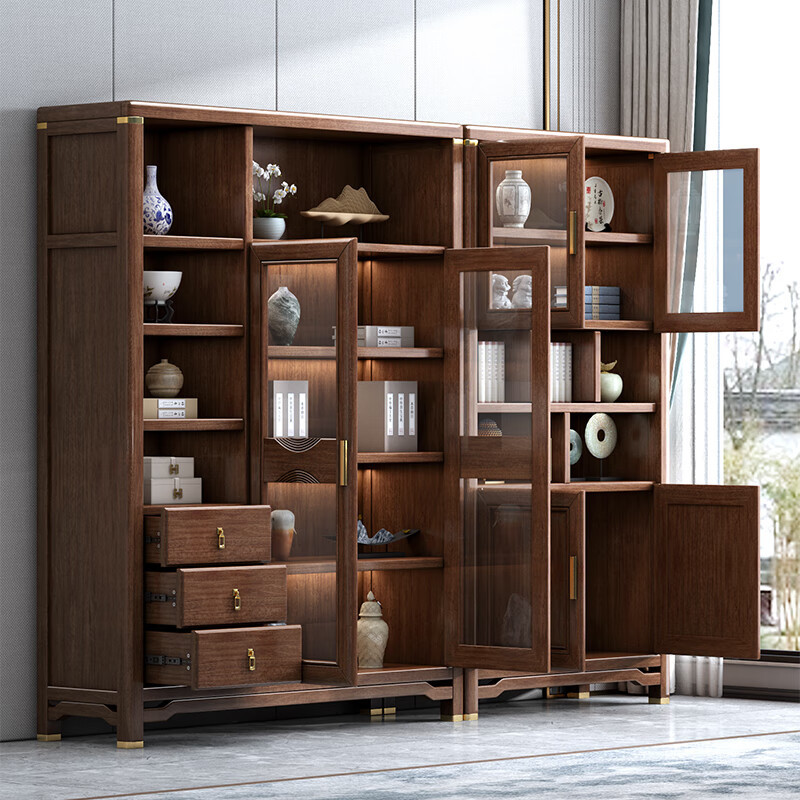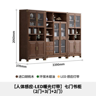Tủ sách bằng gỗ óc chó nguyên khối kiểu Trung Quốc mới có cửa kính và tủ trưng bày Đẹp tích hợp toàn bộ đèn tường tủ kết hợp học tập sang trọng