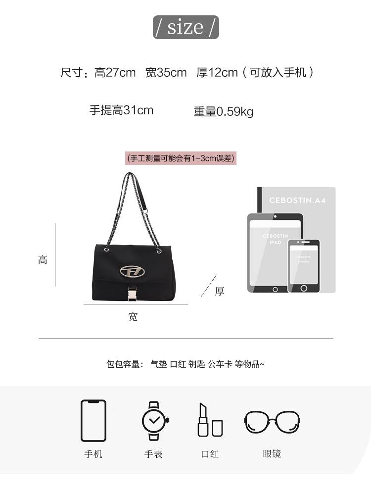 Kích thước hành lý: Lớn Chất liệu lót: Polyester Mã sản phẩm: nini9178 Thương hiệu: Không Cảnh áp dụng: Sắp xếp hàng ngày Màu sắc: Đen Hành lý Phong cách hợp thời trang: Túi tote Loại túi bên ngoài: Túi vá bên trong Nhãn hiệu riêng được ủy quyền: Không có danh sách Năm Mùa: Hè 2023 Độ cứng: Chất liệu mềm: Ni lông Hình dạng hành lý: Ngang, Vuông Phương pháp mở: Túi có mái che Cấu trúc bên trong: Túi đựng điện thoại di động Các yếu tố phổ biến: Chỉ khâu/Độ tương phản màu/Dây xích/Chuỗi Phong cách: Đô thị Đơn giản Số dây đeo vai: Rễ đơn có hoặc không có lớp xen kẽ: Không