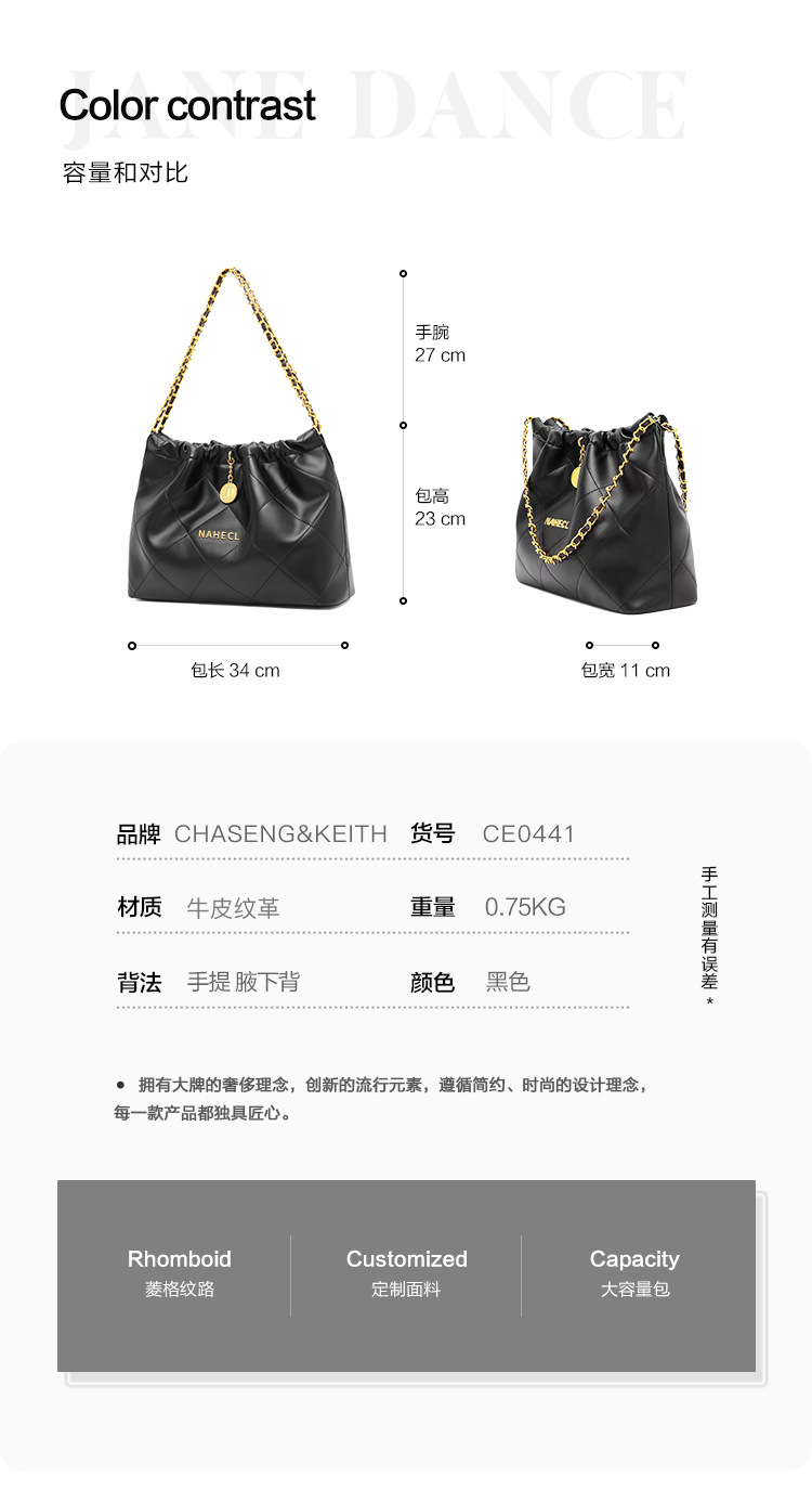 Kích thước túi: Nhỏ Chất liệu lót: Polyester Mã sản phẩm: C&K0441 Thương hiệu: CHASENG&KEITH Cảnh áp dụng: Sắp xếp hàng ngày Màu sắc: Đen (có LOGO)/Đen (Không LOGO)/Đen (Không LOGO) Xu hướng túi Phong cách: Túi tote Loại túi: Túi mở có thương hiệu riêng được ủy quyền: Có Năm niêm yết Mùa: Mùa xuân 2023 Độ cứng: Mềm Chất liệu: PU Hình dạng túi: Hình vuông nằm ngang Phương thức mở: Túi khóa nam châm Cấu trúc bên trong: túi ẩn có khóa kéo/túi điện thoại di động/túi tài liệu/túi đựng chứng chỉ Các yếu tố phổ biến: Hình thoi/ Chuỗi/Chuỗi Phong cách: Đi công tác Số lượng dây đeo vai: Đơn Có hoặc không có lớp xen kẽ: Không có
