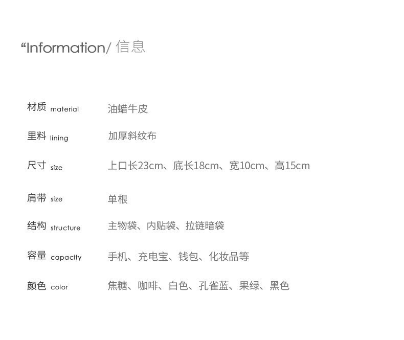 Kích thước túi: Nhỏ Chất liệu lót: Polyester Mã hàng: 9261 Thương hiệu: Khác Cảnh áp dụng: Sắp xếp hàng ngày Màu sắc: Nâu/Đen/Trắng ngọc trai/Xanh bơ/Màu cà phê/Xanh con công/Xanh con công Phong cách xu hướng: Túi vỏ sò Loại túi bên ngoài : Bên trong Các túi vá có thương hiệu riêng được ủy quyền: Có Cortex Các tính năng: Da sáp dầu Năm niêm yết Mùa: Mùa xuân 2023 Độ cứng: Chất liệu mềm: da thật Túi điện thoại di động/túi tài liệu/túi khóa kéo xen kẽ/túi khóa kéo xen kẽ Các yếu tố phổ biến: đường may Kiểu đường may: xu hướng đường phố Số dây đeo vai: đơn Có hoặc không có lớp xen kẽ: có