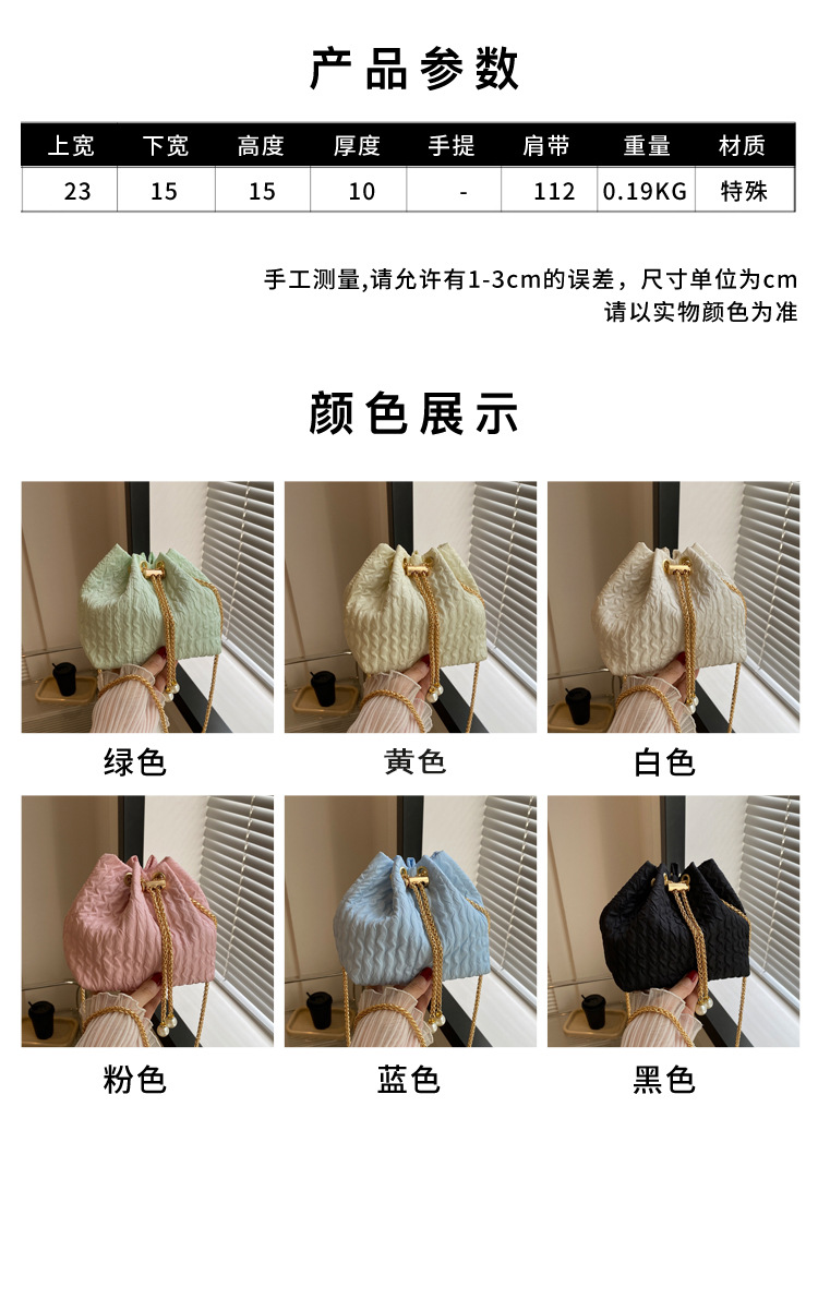 Kích thước hành lý: Trung bình Chất liệu lót: Nylon Mã số: 8899 Các cảnh áp dụng: Sắp xếp hàng ngày Màu sắc: Xanh lá/Vàng/Trắng/Hồng/Xanh dương/Đen/Đen Mùa hè Độ cứng: Mềm Chất liệu: PU Hình dạng túi: Loại xô Phương pháp mở: Túi dây rút Cấu trúc bên trong: Túi đựng điện thoại di động Các yếu tố phổ biến: Kiểu may: Xu hướng xuyên biên giới Số lượng dây đeo vai: Đơn Có hoặc không có Lớp giữa: Không có