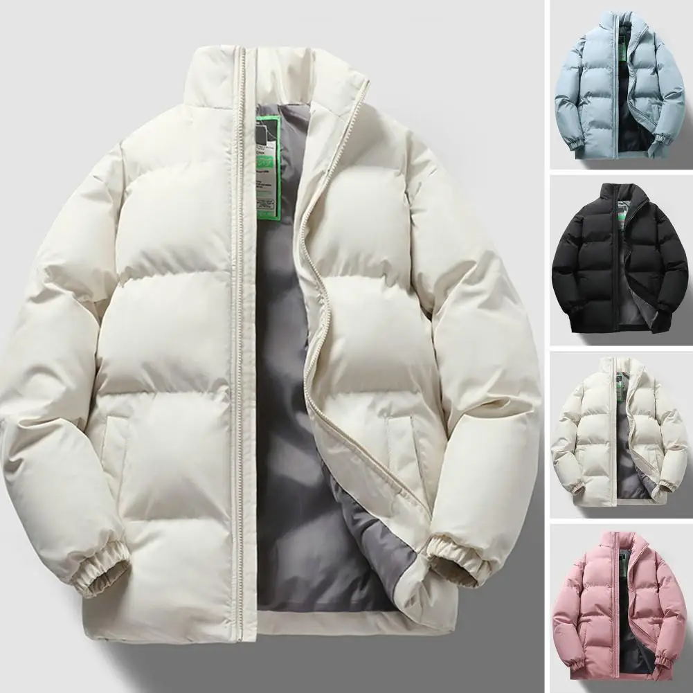 Introducing our versatile and cozy cotton coat! This padded jacket is designed with a solid color stand-up collar, adding a touch of style to your winter wardrobe. The elastic cuffs provide extra protection against the wind, ensuring you stay warm and comfortable. With multiple pockets, you can conveniently store your belongings while on the go. The loose version allows for layering, making it perfect for colder days. Additionally, this cotton coat can be worn as a couple's outfit, allowing you to match with your boyfriend or girlfriend. Stay fashionable and snug this winter with our cotton coat!