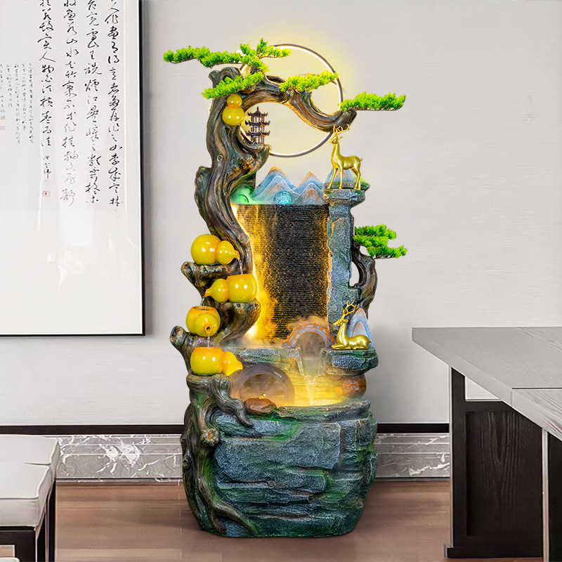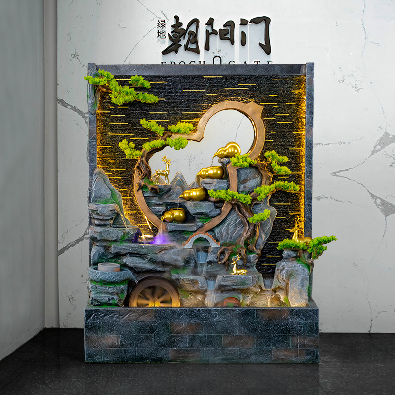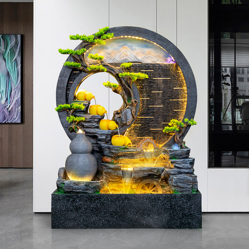 Vách rèm nước, bình nước chảy, non bộ đài phun nước, cảnh nước tuần hoàn, trang trí bầu bí, bánh xe phong thủy may mắn, trang trí trần nhà phòng khách