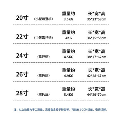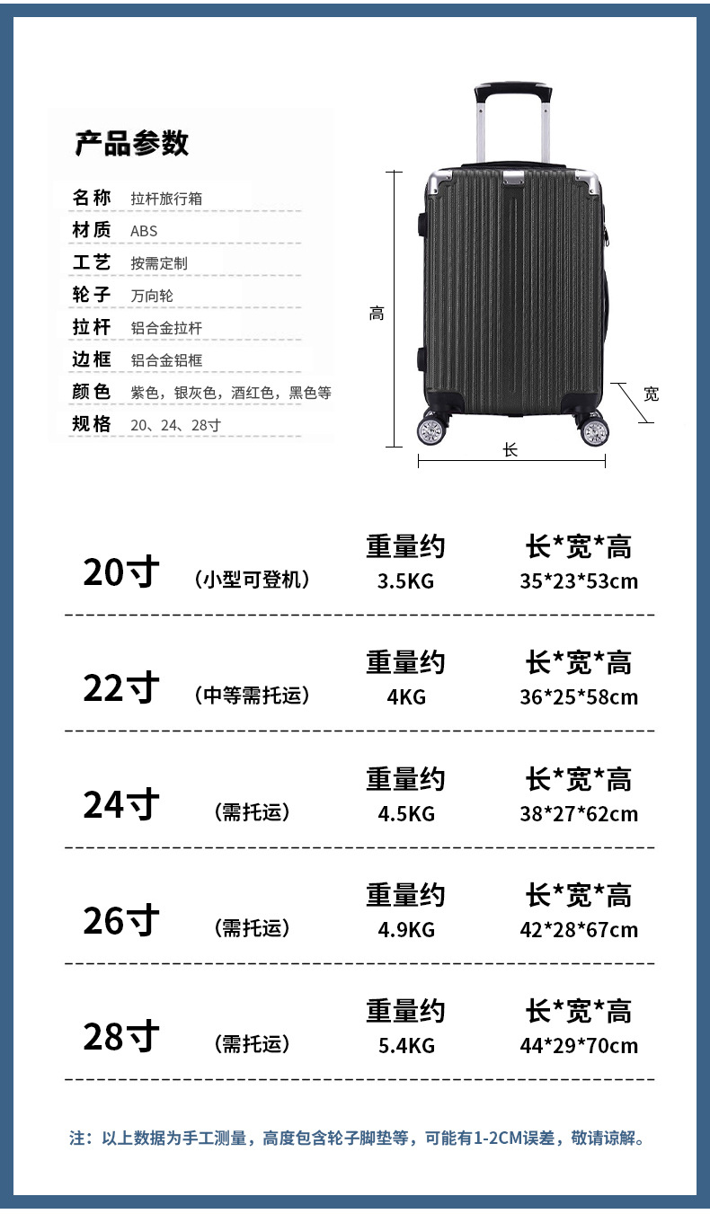 Hoa văn: Sọc lót Kết cấu: Polyester Có lớp giãn nở hay không: Không Mã số: 1366A Thương hiệu: Zhongtang Huixin Cảnh áp dụng: Du lịch giải trí Màu sắc: Xanh lá/Đen/Đỏ rượu/Xám nhạt/Xanh đậm/Xanh đậm Phương pháp gia công: Tùy chỉnh Kiểu con lăn: Bánh xe phổ thông Nơi nhập khẩu: – Thương hiệu riêng được ủy quyền: Không áp dụng Giới tính: Unisex / cả nam và nữ Trọng lượng: 2,5kg Năm niêm yết Mùa: Mùa xuân 2023 Loại phụ kiện: Tư vấn dịch vụ khách hàng Chức năng: 1326527568 Chất liệu: Chất liệu ABS Kích thước: 20 inch/24 inch/28 inch/28 inch Phương pháp mở: loại khóa dây kéo: khóa kết hợp thông thường