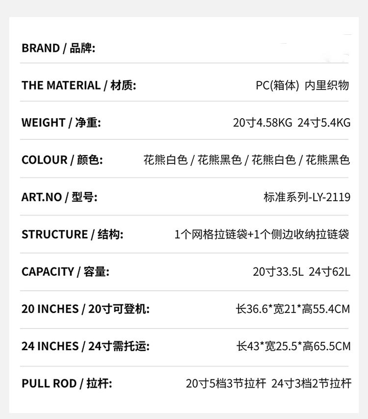 Hoa văn: Động vật Kết cấu lớp lót: Polyester Có lớp giãn nở hay không: Không Mã sản phẩm: 1003 Thương hiệu: YHJM Cảnh áp dụng: Đi công tác Màu sắc: Đen [Gấu khối lập phương xám]/Trắng [Gấu khối lập phương xám]/Đen [Gấu khối lập phương tím] /Trắng [Gấu hình lập phương màu tím]/Đen [Gấu hình lập phương màu xanh]/Trắng [Gấu hình lập phương màu xanh lam]/Đen [Gấu hình lập phương màu đỏ hồng]/Trắng [Gấu hình lập phương Rubik hoa hồng]/Đen [Gấu hình lập phương màu lục lam]/Trắng [Gấu hình lập phương màu lục lam] ] /Trắng [Gấu Rubik’s Cube màu lục lam] Kiểu con lăn: Bánh xe phổ thông với thương hiệu riêng được ủy quyền: Không áp dụng Giới tính: Unisex / cả nam và nữ Cân nặng: 6kg Năm niêm yết Mùa: Hè 2023 Chức năng: Chống trộm/nội trú/có thể là vật liệu nội trú : PC Kích thước: 20 inch/24 inch/24 inch Phương thức mở: khung nhôm Loại khóa: khóa kết hợp TSA Yếu tố phổ biến: khóa gài
