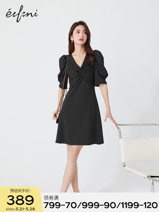 Váy Evelyn 2022 mới tính khí đi làm váy đen cổ chữ v eo váy ngắn tay phồng váy mỏng