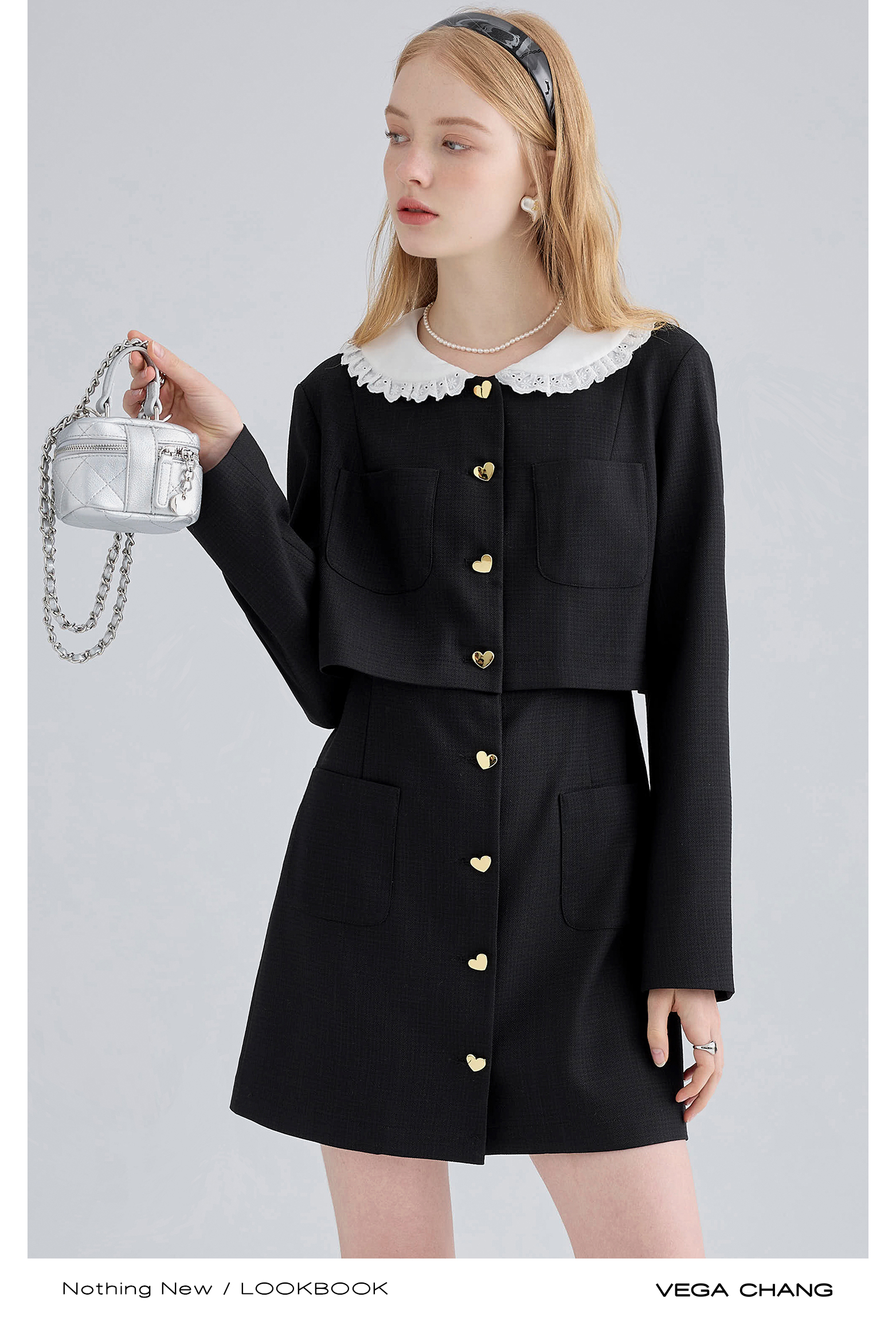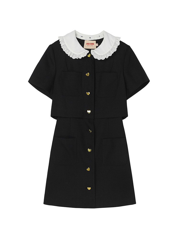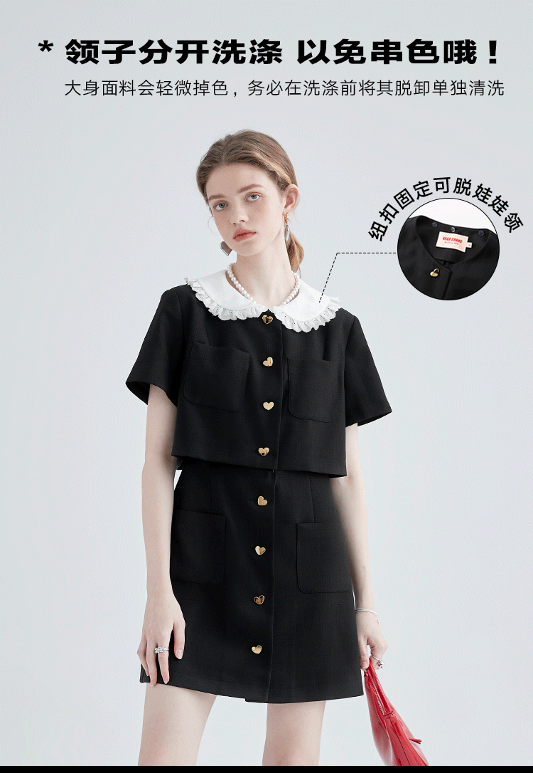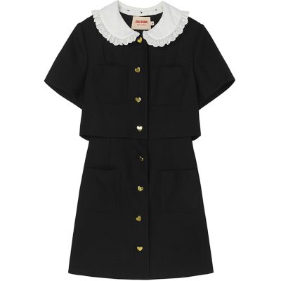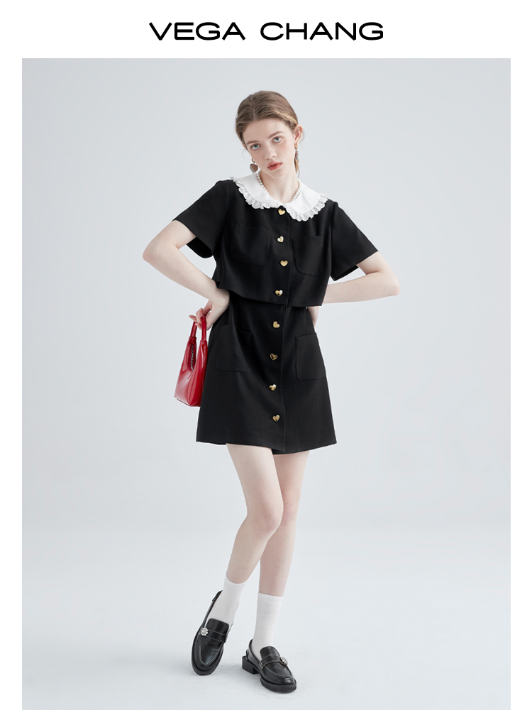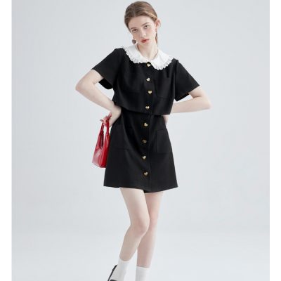 VEGA CHANG váy đen hai mảnh nữ búp bê mùa hè cổ áo Pháp eo thon gọn khí chất