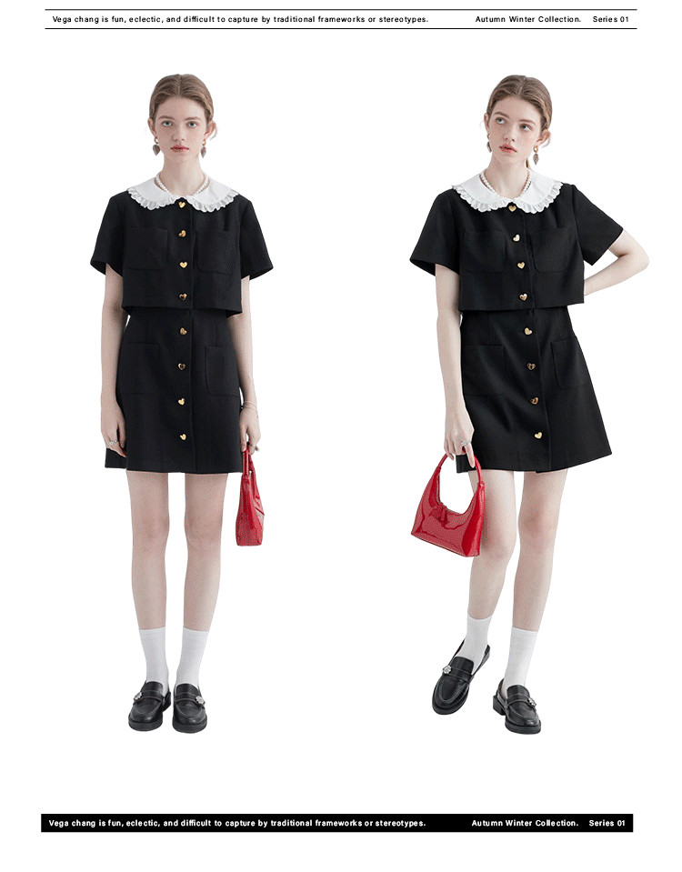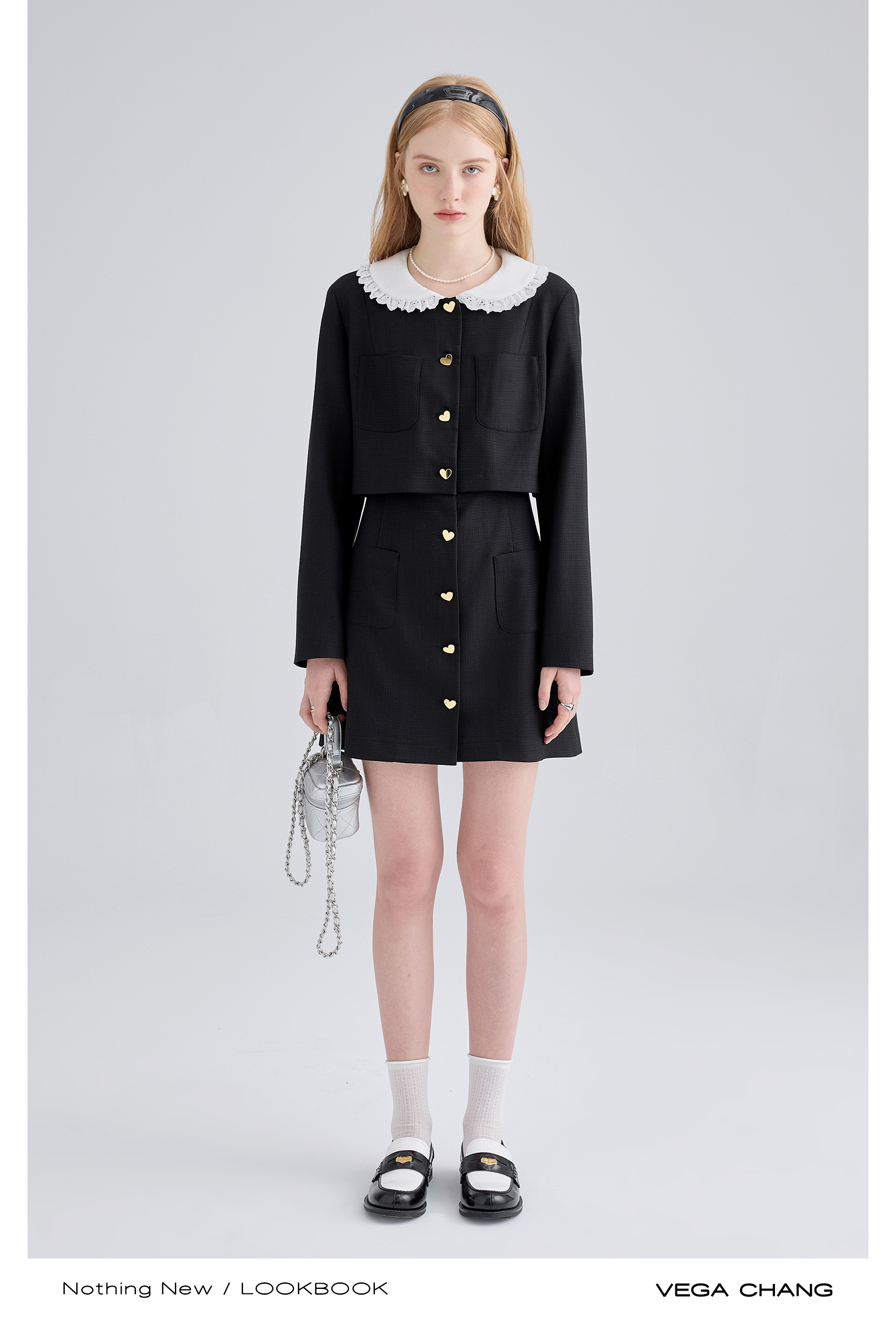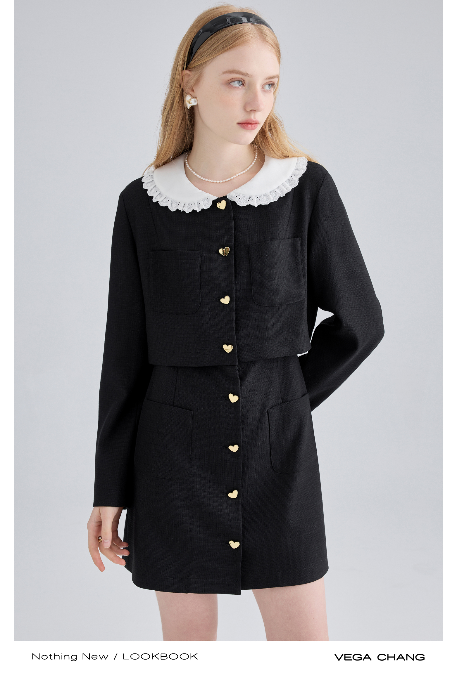 VEGA CHANG váy đen hai mảnh nữ búp bê mùa hè cổ áo Pháp eo thon gọn khí chất