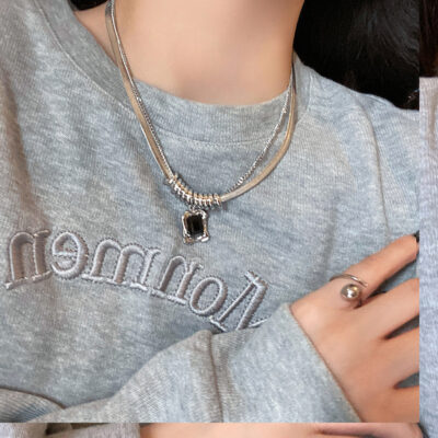 Vòng cổ áo len hai lớp bằng thép titan đen trắng zircon hip-hop nữ mùa thu đông 2023 dây chuyền áo len thiết kế thích hợp mới