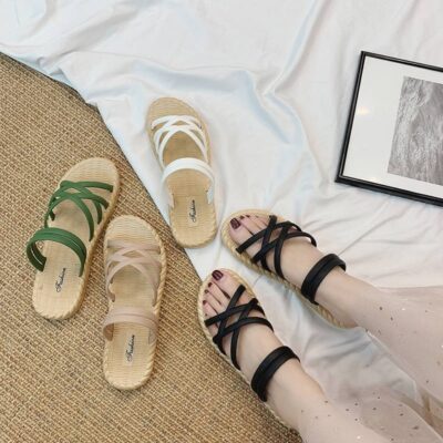 Xăng đan và dép đi trong nhà thời trang mùa hè mới phù hợp với tất cả phụ nữ đế bằng phiên bản Hàn Quốc hai mang lưới Xăng đan La Mã đế dày đi biển cho nữ