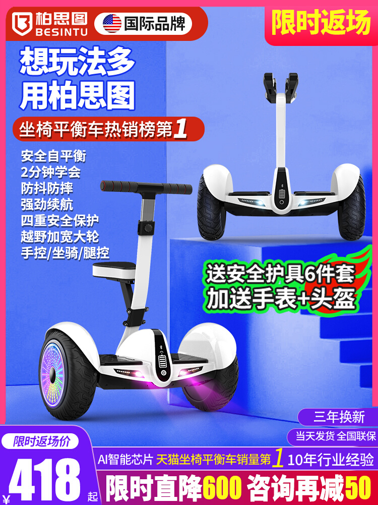 - 颜色分类: ?为什么选择座椅平衡车? ?【活动送护具头盔】座椅车销量第1 2公里24V体验版【限购一台+无礼品+无保修】 36v时尚白【手控+坐骑+6.5吋防爆轮】 36v青春粉【手控+坐骑+6.5吋防爆轮】 36v街舞版【手控+坐骑+6.5吋防爆轮】 ↓↓以下为54V♥新升级旗舰款↓↓ 54v旗舰白【手/坐骑/炫光轮/MC】 54v旗舰粉【手/坐骑/炫光轮/MC】 54v旗舰蓝【手/坐骑/炫光轮/MC】 54v旗舰漫【手/坐骑/炫光轮/MC】 ↓↓以下为54V♥推荐PRO款,80%的客户选择♥↓↓ 54vPRO白【强劲电芯/AI智能保护/彩屏仪表/MC】♥ 54vPro黑【强劲电芯/AI智能保护/彩屏仪表/MC】♥ 54VPro粉【强劲电芯/AI智能保护/彩屏仪表/MC】♥ 54vPro蓝【强劲电芯/AI智能保护/彩屏仪表/MC】♥ 54vPro漫【强劲电芯/AI智能保护/彩屏仪表/MC】♥ ↓↓↓以下为智能芯片SUV越野款,全能通用型↓↓↓ 54vSUV白【AI芯片/防护3系统/智能减速/MC氛围】 54vSUV黑【AI芯片/防护3系统/智能减速/MC氛围】 54vSUV粉【AI芯片/防护3系统/智能减速/MC氛围】 54vSUV蓝【AI芯片/防护3系统/智能减速/MC氛围】 54vSUV漫【AI芯片/防护3系统/智能减速/MC氛围】