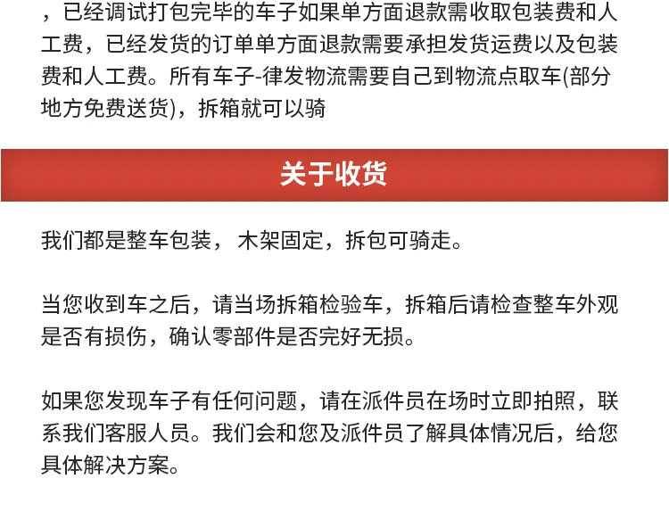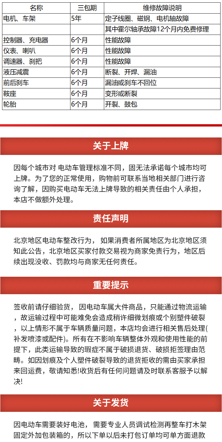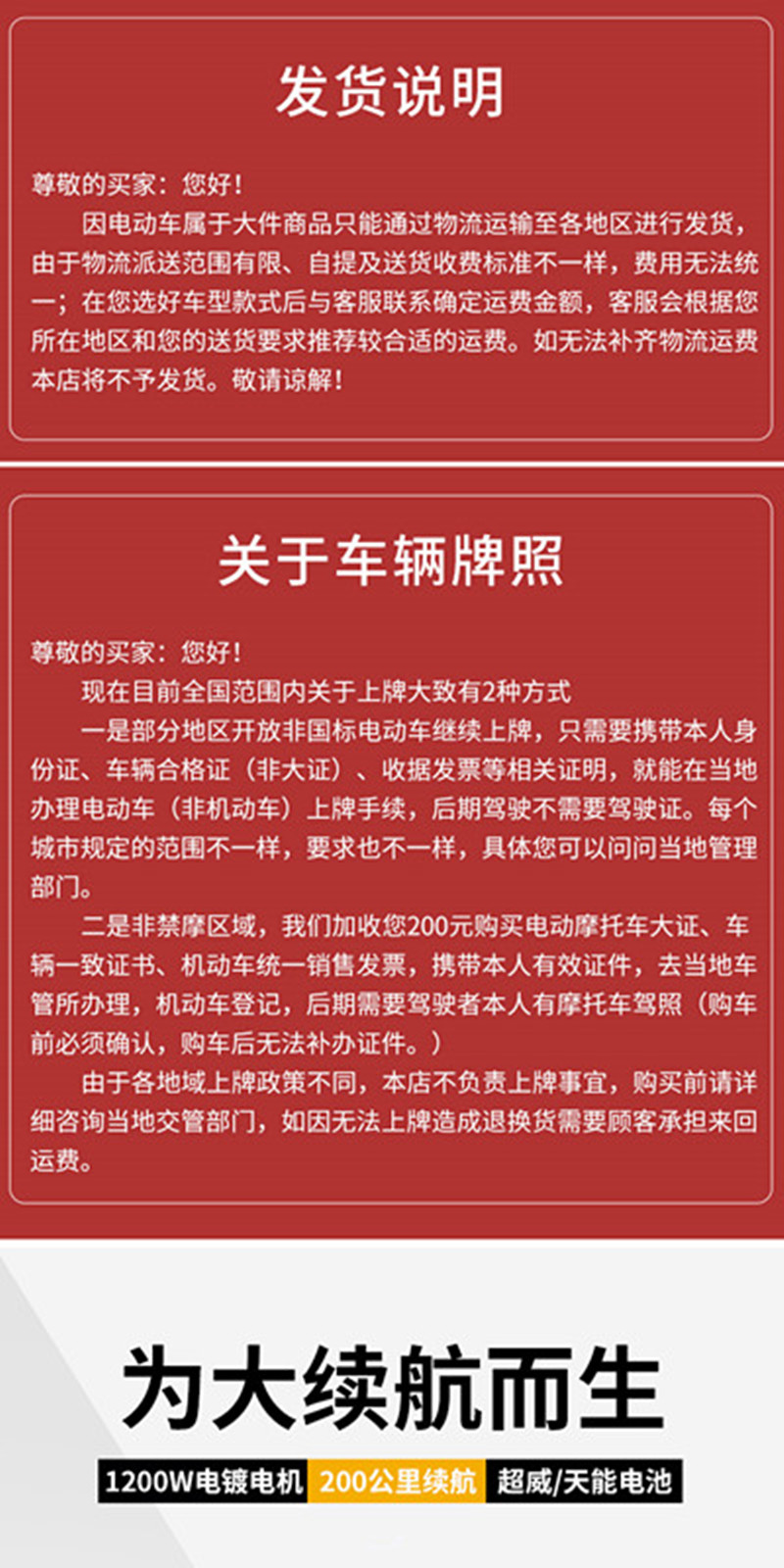 酷迷机车,厂家直销!质量保证!本店所出售的车子全部采用超威或天能国内大品牌电池,全国可上牌(限摩地区除外),上牌详细咨询客服。关于运费,因系统无法设置统一运费模板,系统显示为包邮,实际大部分地区不可包邮需补运费差价,全国运费100-500不等,具体运费金额咨询客服。大件物品,默认发物流,物流需到当地自提点自提,有些乡镇可以送达,带电池的拆了包可以骑行,非常方便。声明,如果买家没有和客服沟通,或直接买下商品,本店默认运费买家到付,请仔细阅读商品详情。本产品分三个款式配置,分别是尊贵版、旗舰版、终极版,主图视频中所展现的是终极版,主图颜色所展示的只是颜色图,三个款式配置都有。