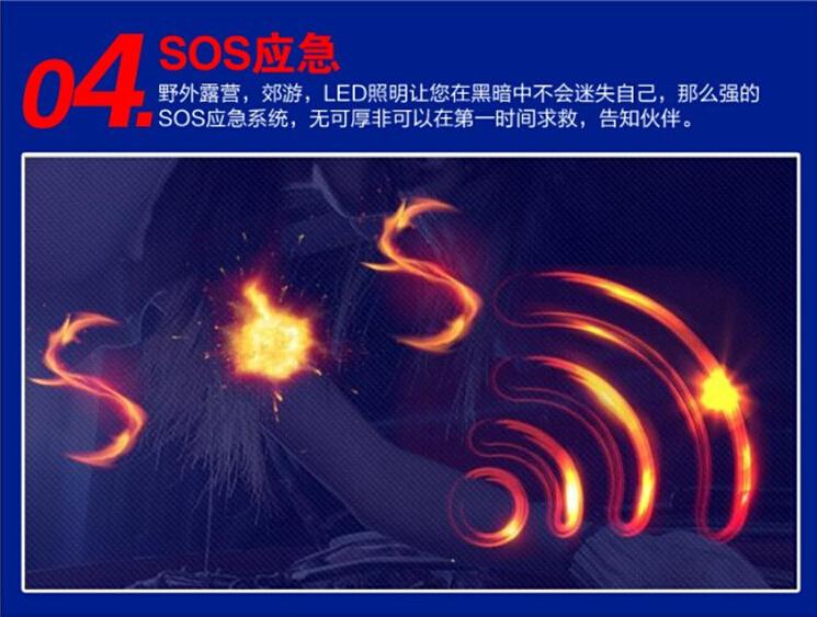 5、若需使用LED照明功能,长按开关键5秒启动照明功能,之后短按开关键切换照明状态。依次为:强光、爆闪、SOS、关闭