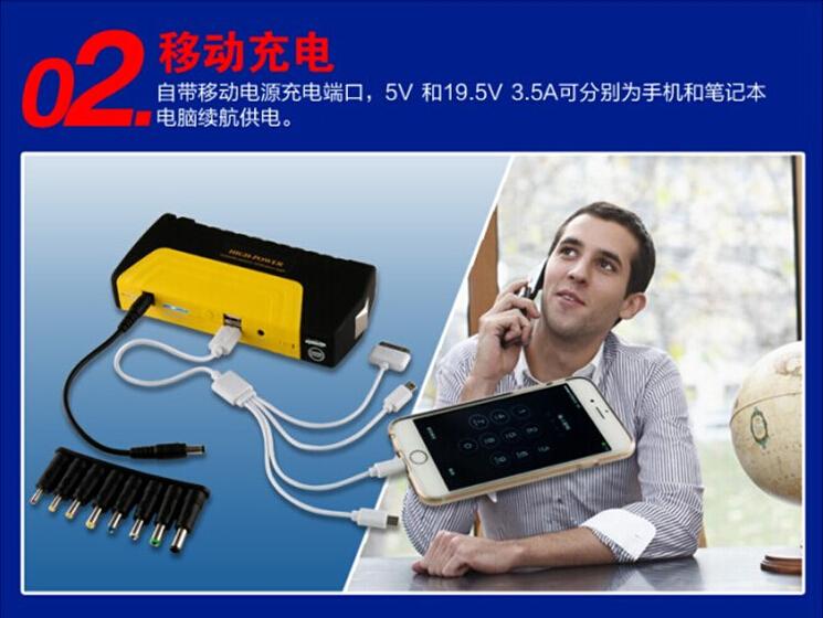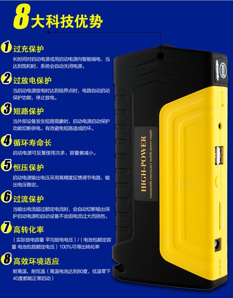 专利技术,同类产品体积最小、质量最轻; 采用16800mAh高容量高功率聚合物电芯,支持快速充电,自放电低,循环充放电次数多达5000次; 支持12V汽车应急启动、各品牌手机、PSP、MP3/MP4掌上电脑PDA、笔记本等多种产品充/供电,同时具备照明功能; 多重安全防护设计,保证产品安全使用