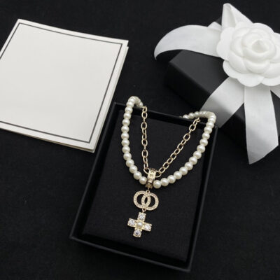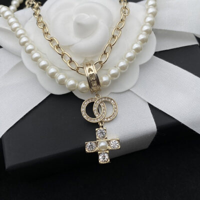 Xiaoxiang Mới Đôi C Chữ Thập Vòng Cổ Ngọc Trai Thơm Granny Chuỗi Kim Loại Ngọc Trai Thiết Kế Kim Cương Xiaoxiang Vòng Cổ