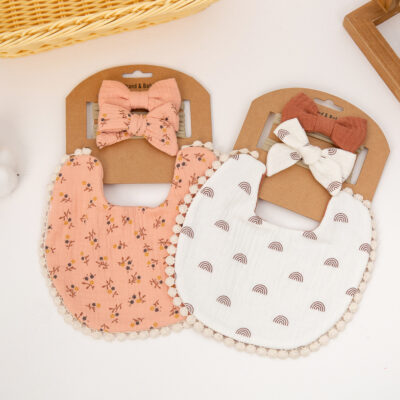 Yếm in hình em bé xuyên biên giới Yếm cotton gạc hai lớp trẻ em Bộ băng đô nơ trẻ em