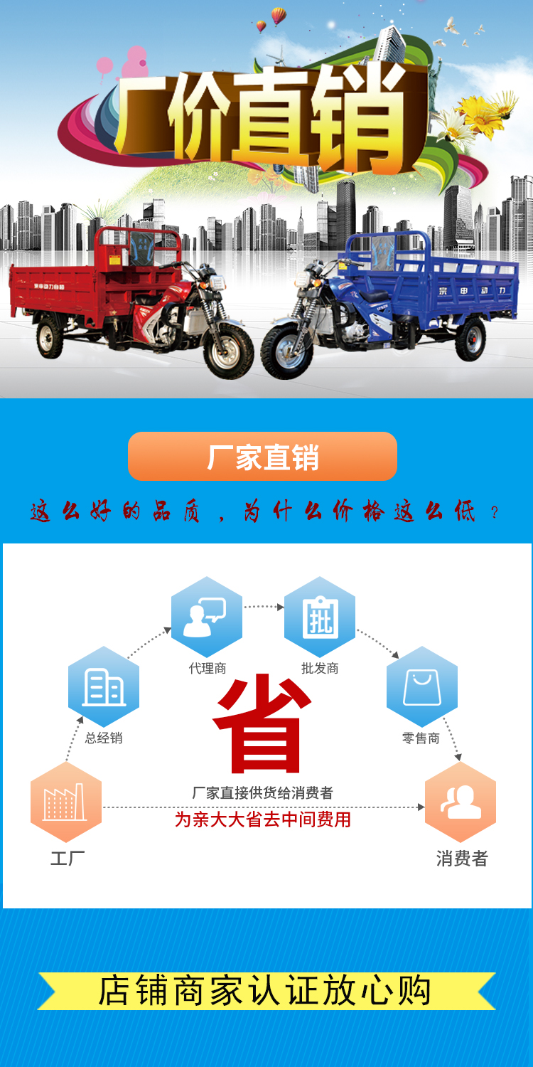 运费说明:由于三轮整车运输各地区运费差距巨大,我方无法全部承担偏远地区运费。因此,新疆,西藏,四川,广西,广东,甘肃,云南,青海,海南,贵州等有的偏远地区请联系客户补运费差价,运费不足,本店有权不发货!本店销售商品,均使用宗申发动机,非宗申品牌。