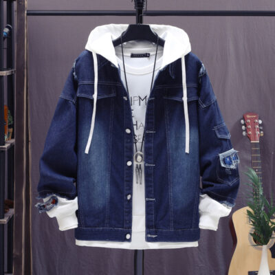 Mùa thu áo khoác mới thời trang nam hợp thời trang có mũ trùm đầu denim quần áo trẻ nối quần áo denim rách