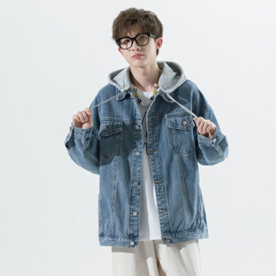 Áo khoác denim nam mùa thu mới phong cách Hàn Quốc có mũ trùm đầu nam xu hướng rộng dụng cụ denim hàng đầu quần áo