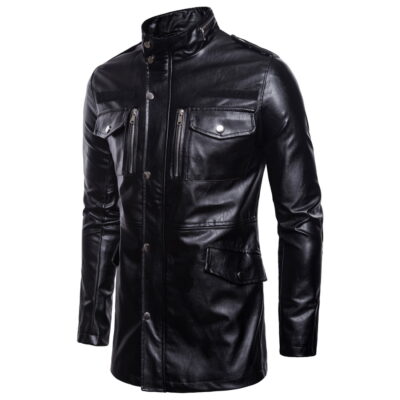 2023 ngoại thương mùa thu đông mới màu trơn áo khoác da nam dài vừa cổ áo khoác da mô tô 4 túi B036