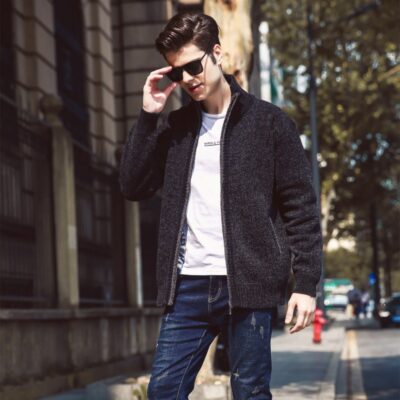 [Cộng với nhung và dày] áo len mùa đông nam áo len dệt kim cardigan lót dây kéo áo khoác giản dị một thế hệ tóc