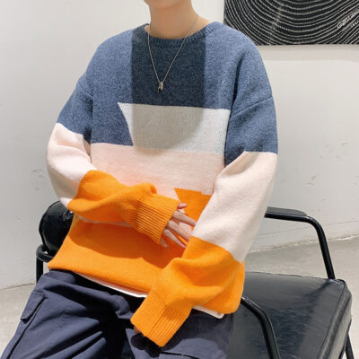 Áo len nam mùa thu đông màu tương phản phong cách Hồng Kông Áo len sọc Hàn Quốc hợp thời trang áo len chui đầu rộng phù hợp với mọi lứa tuổi