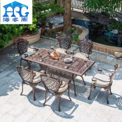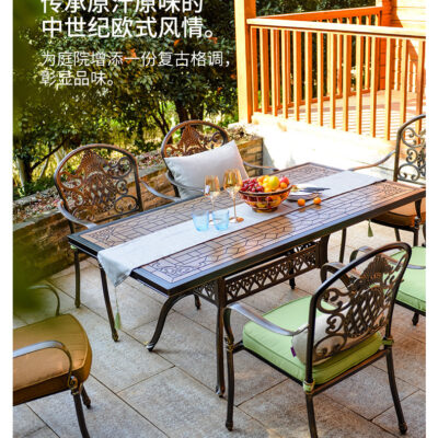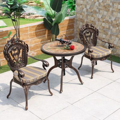 Bàn ghế sân vườn đẹp. Bàn trống đồng, ghế hoa hồng có tay vịn