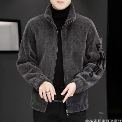 Áo len lông cừu cực áo khoác nam bán buôn dày cừu nhung cổ áo đứng cardigan lông cừu nam trung niên áo khoác thường