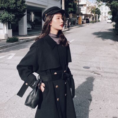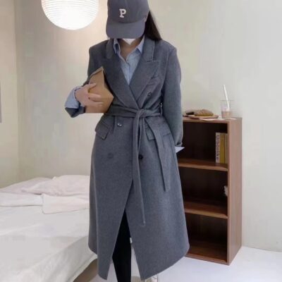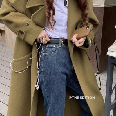 Nhẹ nhàng sang trọng phong cách Hepburn Hàn Quốc hai mặt áo khoác len dáng dài thắt eo khí chất Áo khoác len ins phong cách