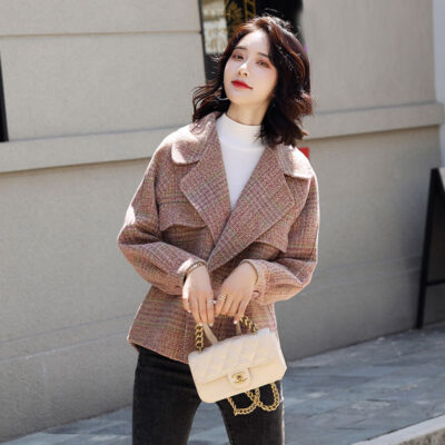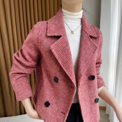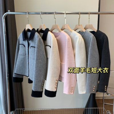 Áo khoác len nữ nhỏ ngắn kẻ sọc mùa xuân và mùa thu len hai mặt phù hợp với kích thước trung bình phụ nữ nhỏ cashmere áo khoác len