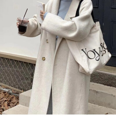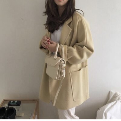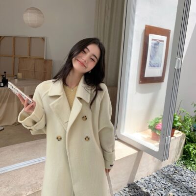 Áo khoác len hai mặt dáng rộng dáng rộng phiên bản Hàn Quốc mùa thu đông màu kem ấm áp phù hợp với mọi đối tượng nữ