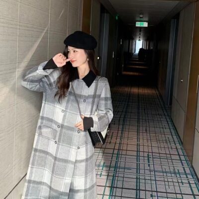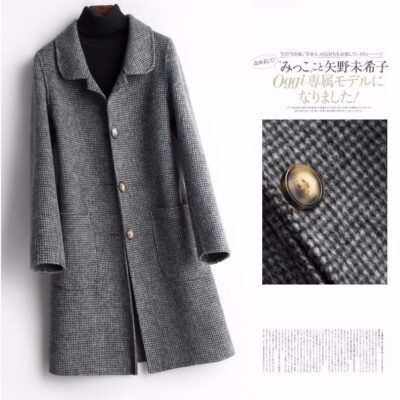 Búp Bê Houndstooth Cổ Áo Khoác Len Dài Giữa Hàn Quốc 2 Mặt Áo Khoác Len Rời Size Lớn