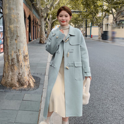 Áo Khoác Len Cashmere Màu Xanh Nhạt, Thu Đông 2023, Mới Dài Trung Bình, Khóa Sừng Nhỏ, Áo Khoác Len 2 Mặt