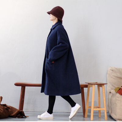 Mùa Đông Văn Học Nghệ Thuật Retro Len Nặng Ve Áo Lưng Điện Đơn Áo Gió Dài Ấm Áp Có Lông Áo Khoác