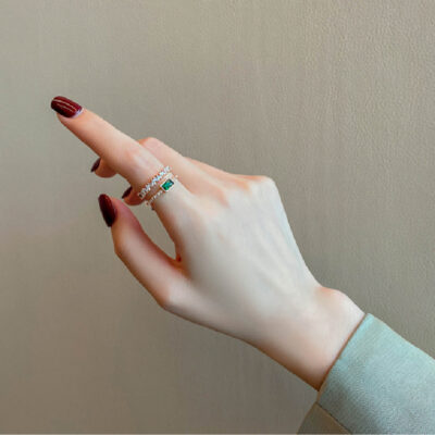 Tính khí đơn giản con công màu xanh lá cây kim cương nhẫn hai lớp nữ ins hợp thời trang ngón trỏ mở nhẫn lưới màu đỏ cùng phong cách phong cách cổ điển