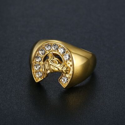 Âu Mỹ quốc tế mới hip-hop HIPHOP nhẫn thép titan mạ vàng kim cương giả đầu ngựa hộp đêm hipster nhẫn nam