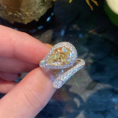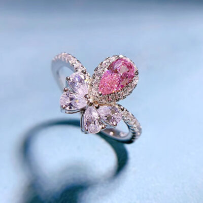 Trang sức Mujing 2023 mới S925 bạc carbon cao kim cương kim cương hồng 4*7 hình quả lê nhẫn nữ Châu Âu và Mỹ Vòng gió Ins