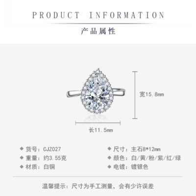 Người nổi tiếng trên Internet bùng nổ vương miện sang trọng kim cương carbon cao hình giọt nước mô phỏng tourmaline màu hồng kho báu nhẫn mở nhẫn đính hôn nhẫn kim cương