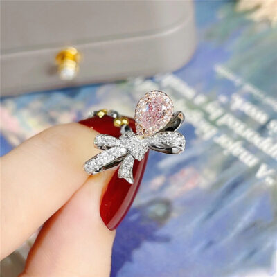 Ins màu hồng nhạt sang trọng dịu dàng khảm vi khí chất đầy kim cương zircon nơ hình giọt nước khí chất đa năng dễ thương phong cách mở nhẫn