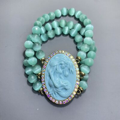 Thời Trung Cổ Phong Cách Phương Tây Ba Chiều Chạm Khắc Opal Tự Nhiên Đính Hạt Đàn Hồi Vòng Tay Retro Xanh Nàng Tiên Cá Vòng Tay
